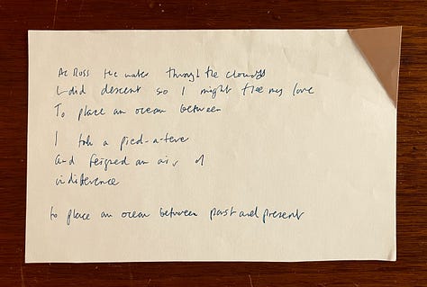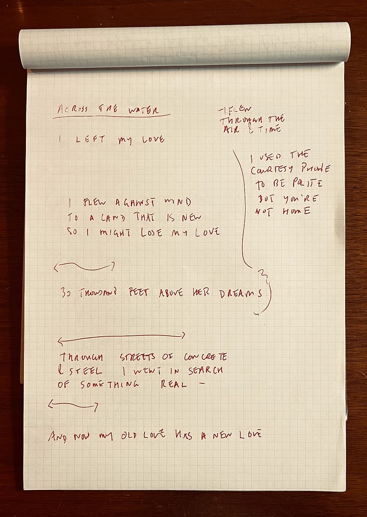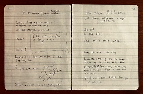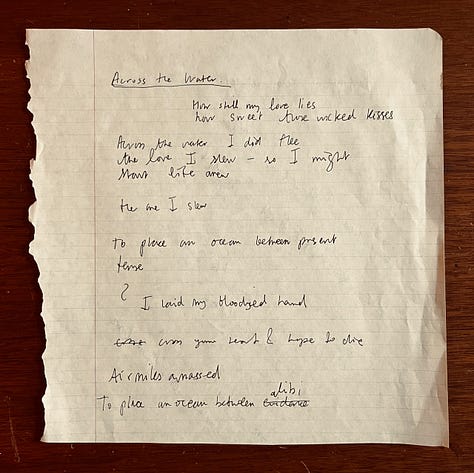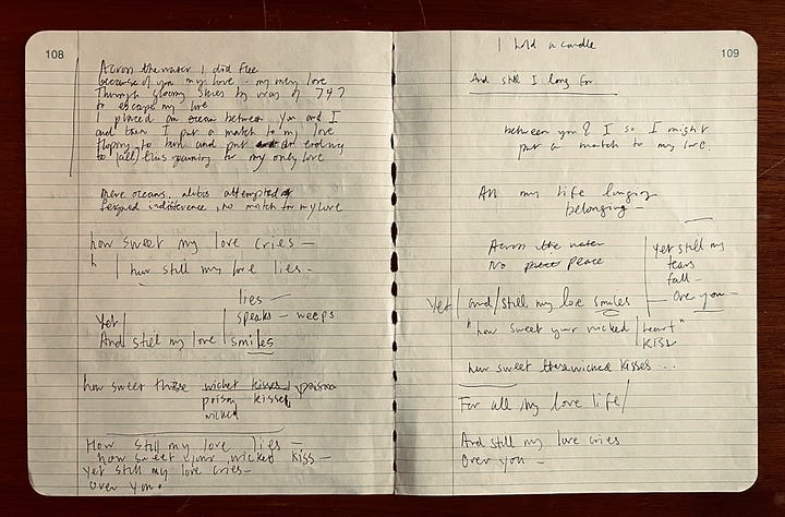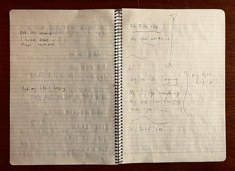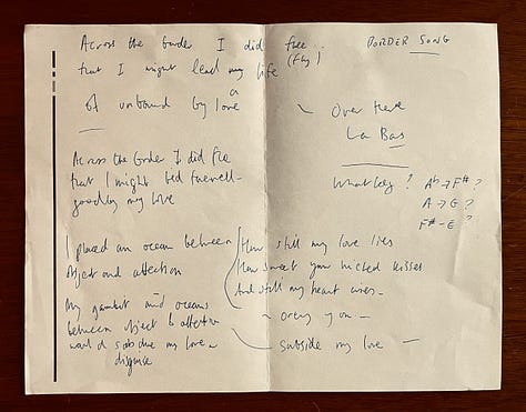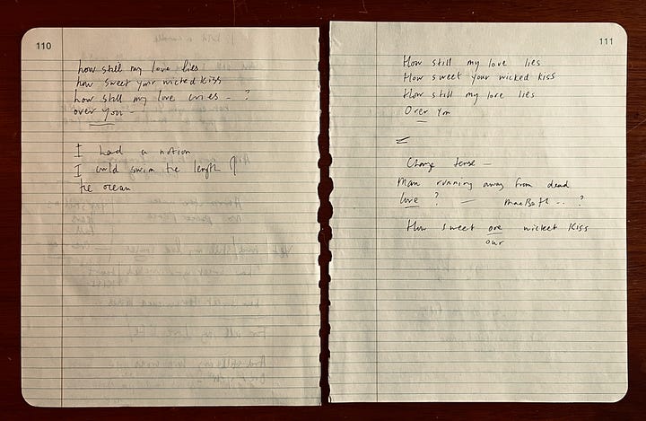 What’s worthy of note, here, I think is how little headway I made with the lyric. The entries repeat the same phrases over and over again. Maybe there are small incremental improvements to the phrasing, the potential lilt. Maybe. But it’s not much. I often start songs with only a hint of an idea, maybe a phrase, or a feeling. But when the writing process is sucessful, this grows into something more substantial. I don’t think that happened here.