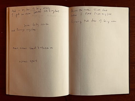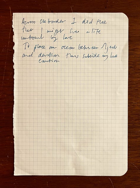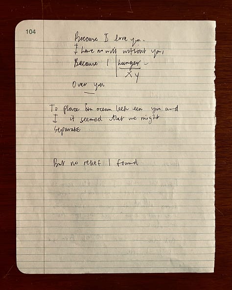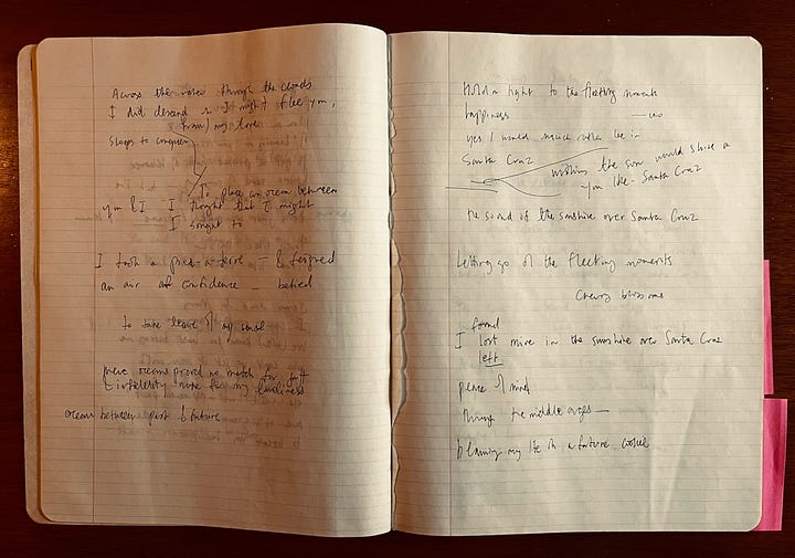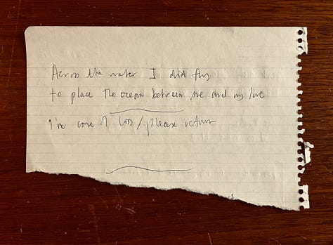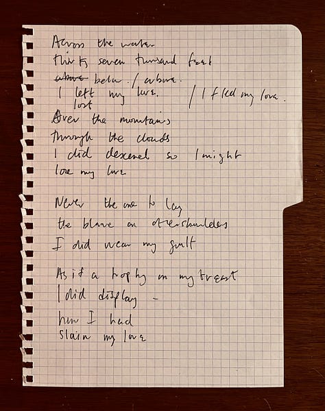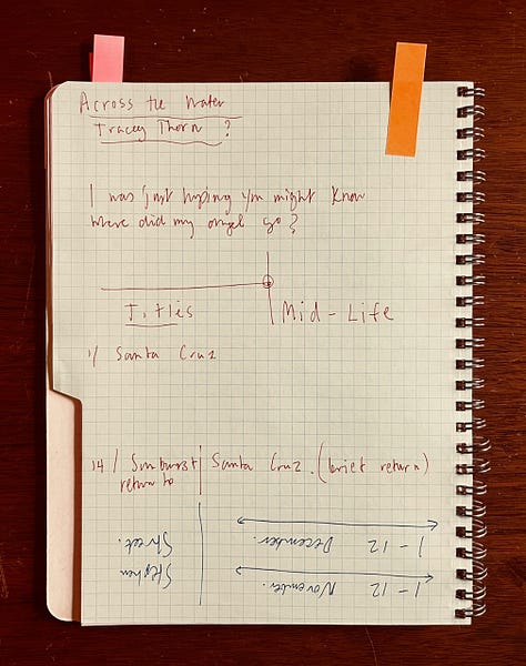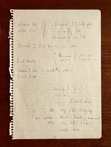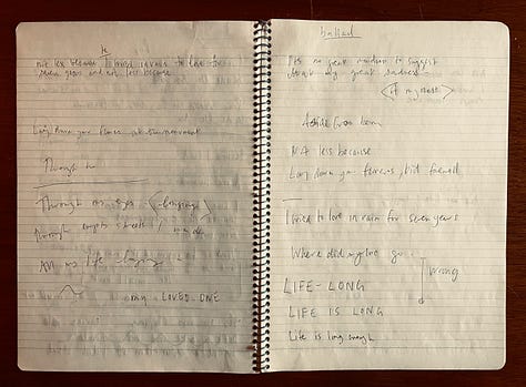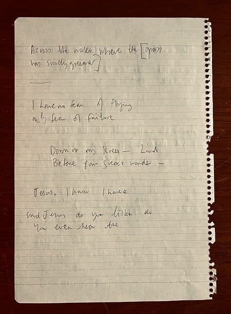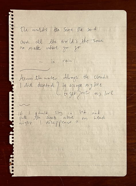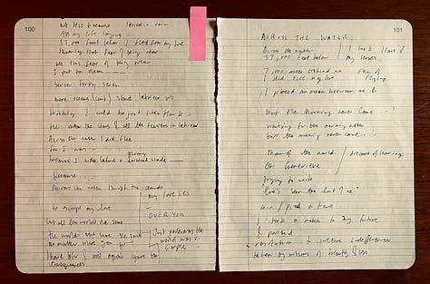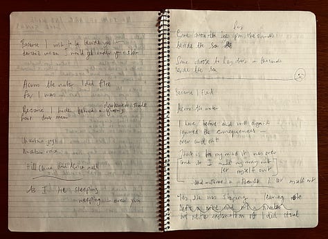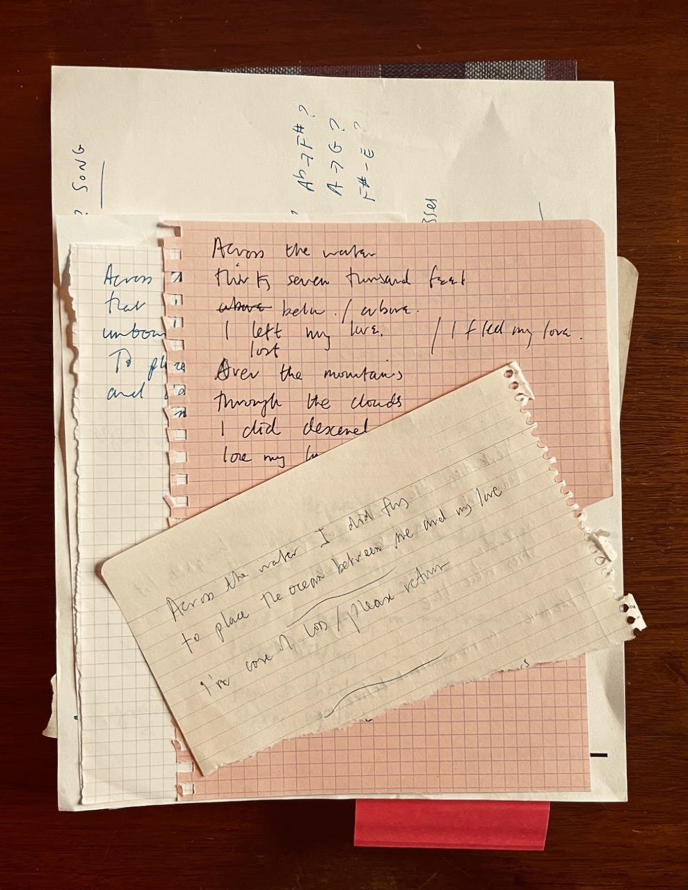 There are a lot of loose sheets, mostly torn from other notebooks. I don’t know why, but I deduce, from this and the sheer volume of the notes over a lengthy time period, that I was pretty keen on this idea. And still there isn’t even a demo with a guide vocal. The instrumental demo is here.